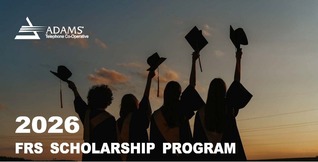 Adams Telephone Co-Operative is pleased to partner with the Foundation for Rural Services (FRS) to offer our cooperative members children the opportunity to apply for a $3,000 scholarship, with FRS funding $2,000 of the scholarship and Adams supplying the remaining $1,000.